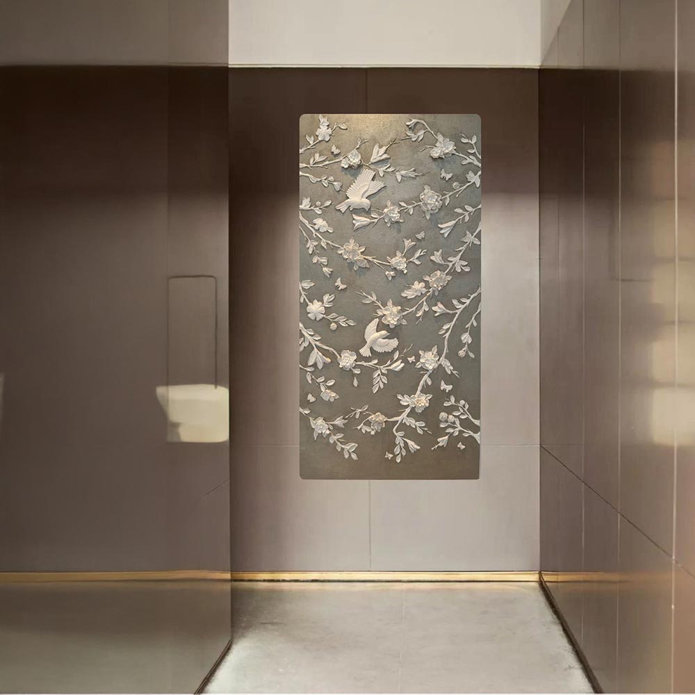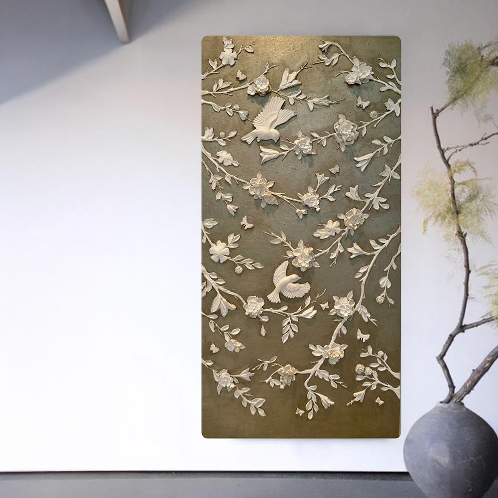 Rendered in soft, neutral tones, the relief-style sculpture brings an elegant and serene atmosphere, emphasizing the natural beauty of flowering trees in springtime. The detailed craftsmanship highlights the intricate textures of the petals, leaves, and feathers, creating a mesmerizing three-dimensional effect. This artwork is a poetic celebration of nature’s awakening, where birds and blossoms come together in a timeless dance of life and renewal.